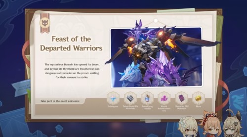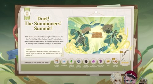 Главное событие же будет целиком и полностью посвящено коллекционной карточной игре Священный призыв семерых. Состоится масштабный турнир, который охватит все представленные в игре регионы. В рамках его сюжетной линии можно будет снова повстречать Сайно, Кокоми, Кэйю и Ху Тао, а также познакомиться с новыми героями: Шарлоттой и Кирарой.