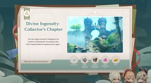 Данный ивент будет включать в себя 4 режима, связанных со сбором печатей, карточными дуэлями, боевыми испытаниями и возвращением вечно движущихся картин. Основной наградой станет 4-звездочный лук Ключ ибиса. Разработчики также добавят немало новых карт, включая карточки Архонтов.