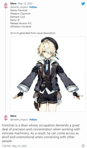 Согласно его словам, речь идет о 4-звездочном герое, который в бою будет использовать двуручный меч. Он также опубликовал его арт, сгенерированный нейросетью на основе его описания. Судя по всему, персонаж будет использовать тело подростка (Беннет, Чун Юнь и так далее). Чуть позднее SYP отметил, что данный рисунок схож с оригиналом лишь на 50% – слишком много лишних деталей.