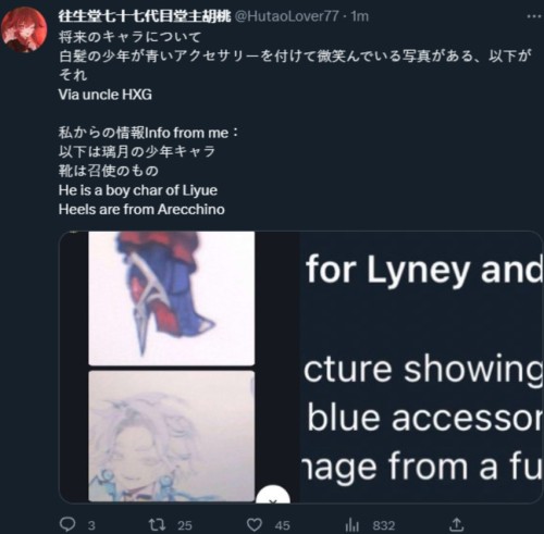 Анонимным инсайдером был размещен портрет неизвестного персонажа, про которого затем подробнее рассказали датамайнеры. К примеру, Plusle и hxg_diluc отметили, что речь идет о 4-звездочном герое родом из Ли Юэ, использующим модель тела подростка (Беннет, Чун Юнь). Для него сейчас подготовлено два дизайна. Первый показан на картинке, а во втором паренек имеет черные волосы и немного другую одежду.