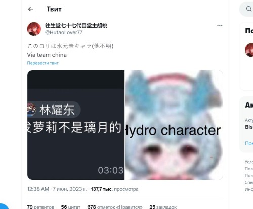 Сегодня инсайдер Tao (Plusle), сославшись на Team China, отметил, что маленькая девочка в белом платье и со странным аксессуаром на голове, похожим на рожки, относится к Гидро стихии. Учитывая ее элемент, можно предположить, что эта героиня окажется родом из Фонтейна. Некоторые считают, что речь идет о Чиори – девушке-дизайнере, открывшей магазин одежды и тканей в Гидро регионе.