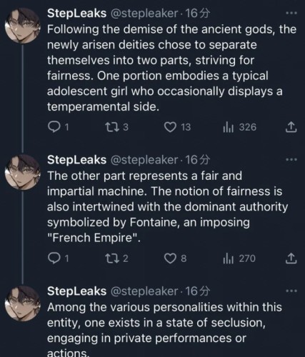 Информатор videreleaks сообщил, что Фокалорс из Genshin Impact разделила свой разум на две отдельные личности. Позднее StepLeaks решил дополнить данную информацию. По его словам, Фурина сделала это после гибели древних богов, стремясь добиться тем самым абсолютной справедливости.