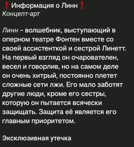 Инсайдер videreleaks также рассказал о характерах Линн и Линетт. Первый является волшебником (фокусником), который выступает в оперном театре Фонтейне вместе со своей сестрой Линетт, выполняющей роль его ассистентки. Он кажется веселым, очаровательным и общительным юношей, однако на деле очень хитер и коварен. Линн постоянно лжет и плетет интриги, мало заботясь о других людях за исключением своей сестры. Его главная цель – это защита Линетт.