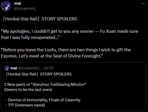 Инсайдер mai рассказал, что в обновлении 1.3 игроков ждут две новые сюжетные главы, связанные с Лофу Сяньчжоу. Судя по всему, они окажутся последними в этом регионе. Плюс, в разработке, по словам Dim, находится новый скин для Март 7. К сожалению, дата его выхода неизвестна.