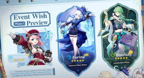 Стало известно, что в первой половине обновления будет выпущена Фурина (Гидро, одноручный меч) и проведен реран Бай Чжу (Дендро, катализатор). Кампанию им составит новая 4-звездочная героиня Шарлотта (Крио, катализатор). В оружейном баннере следует ждать появления одноручного меча Блеск тихих вод и катализатора Великолепие лазурного свода.