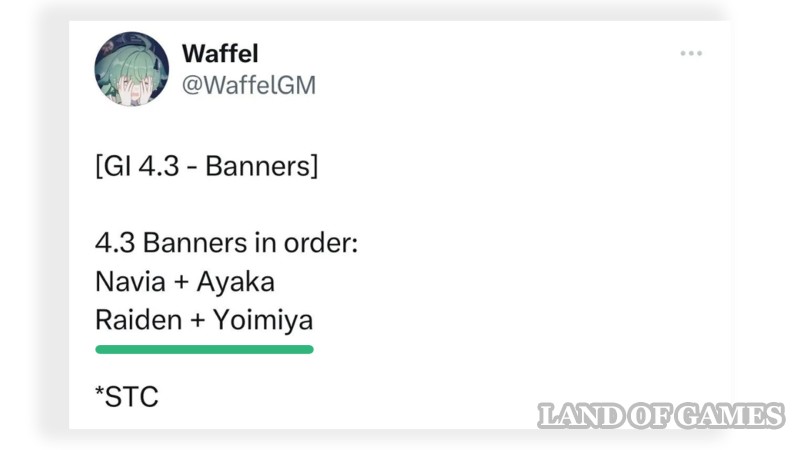 Такие источники, как Waffel и SpendYourPrimos, единогласно заявляют, что в патче 4.3 нас ждет уже четвертое возвращение Еимии, пиро лучницы из Инадзумы, а вместе с этим и следующий порядок баннеров: