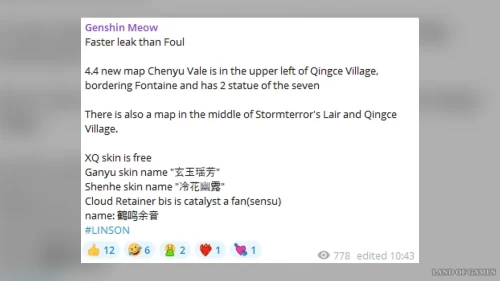 Также мы получаем все больше подробностей касательно долины Чэньюй: сразу несколько источников опубликовали скриншоты карты, на которой отображено местоположение новой локации на севере Гео региона. Инсайдер Foul уточняет, что долина будет иметь две статуи Архонта и станет промежуточной территорией между Ли Юэ и Фонтейном.