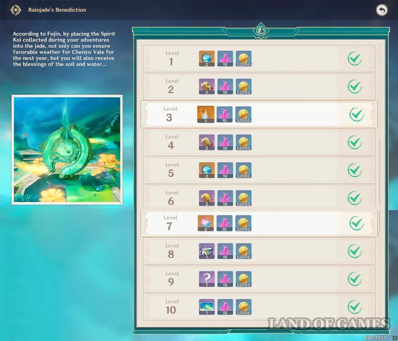 В новой области появится очередное «древо» для Подношения – Нефритовый алтарь. Для его прокачки придется собирать Души Кои, разбросанные по всей долине Чэньюй. Судя по слитым изображениям, алтарь будет иметь всего 10 уровней возвышения, а награды чем-то напоминают прокачку репутации регионов.