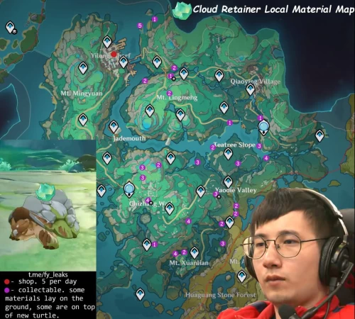 До появления 5-звездочной Сянь Юнь (Анемо, катализатор) в Genshin Impact осталось чуть меньше месяца, поэтому в сети появляется все больше сведений о ней. К примеру, инсайдер fyleaks опубликовал карту долины Чэньюй, на которой отметил расположение местных диковинок, необходимых для возвышения этой героини.
