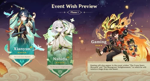 Как оказалось, в первой половине патча состоится выход 5-звездочной Сянь Юнь (Анемо, катализатор) и 4-звездочного Ка Мина (Пиро, двуручный меч). Разработчики также проведут реран Нахиды (Дендро, катализатор). В воплощении божества можно с повышенным шансом получить абсолютно новый катализатор Звонкий клич журавля, являющийся сигнатуркой Хранителя Облаков, и Сновидения тысячи ночей (сигнатурка Дендро Архонта).