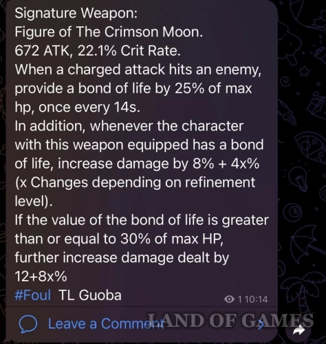 Что касается пассивной способности Фигуры Багровой луны, то при поражении противника заряженной атакой происходит накопление Уз Жизни в размере 25% от максимального здоровья носителя. Эффект проявляется раз в 14 секунд. Кроме того, всякий раз, когда у персонажа с этим оружием имеются Узы Жизни, его общий урон увеличивается на 8% + 4x% (x зависит от уровня пробуждения). Если значение Уз Жизни больше или равно 30% от максимального HP, то наносимый дамаг дополнительно увеличивается на 12+8x%.