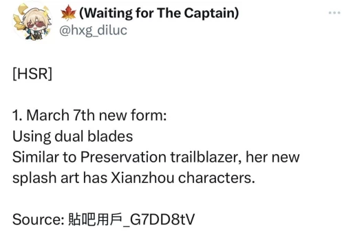 Ранее инсайдеры уже не раз заявляли, что вслед за Дань Хэном новые версии получат и другие члены Звездного экспресса, причем первой на очереди находится Март 7. Сегодня инсайдер hxg_diluc, сославшись на свои источники, раскрыл несколько интересных деталей про нее.