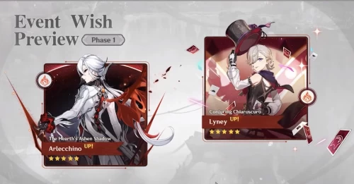 Вначале разберем баннеры грядущего патча: в первой половине с повышенной вероятностью можно будет получить предвестницу Фатуи Арлекино (Пиро, копье) и фокусника Лини (Пиро, лук). В «Воплощении божества» добавят новое копье Очертания алой луны (повышает шанс крита и в руках «Отца» превращается в косу) и лук Первый великий фокус, являющиеся сигнатурным оружием вышеуказанных героев.