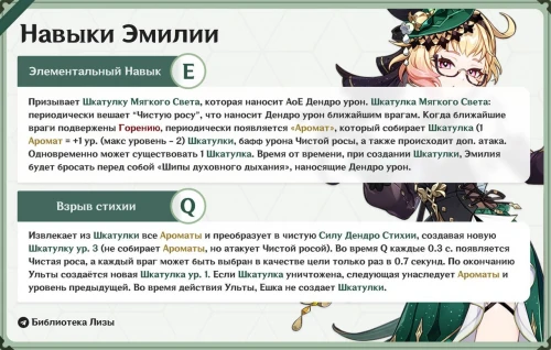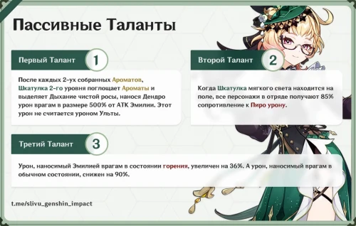 На основании полученной от инсайдеров информации канал «Библиотека Лизы» составил карточки, подробно рассказывающие о талантах и созвездиях Эмилии. По мере прокачки героиня повышает собственный критический урон.
