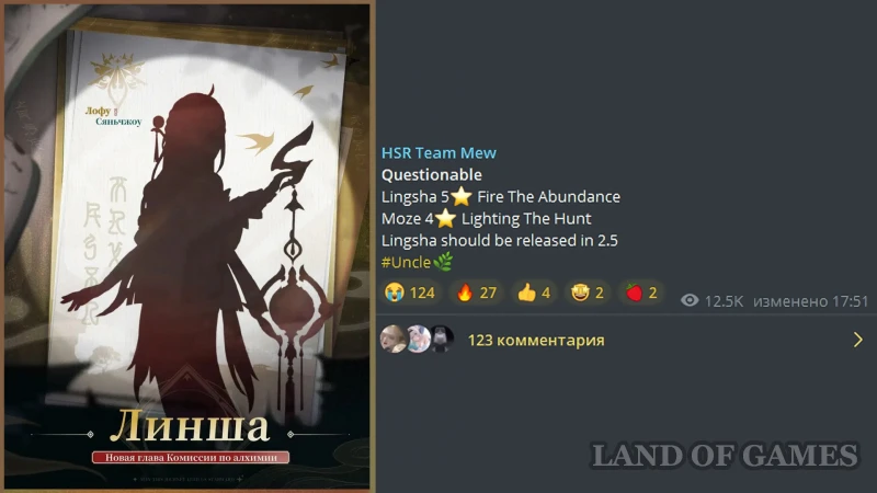 Вслед появилась свежая утечка о дате выхода еще не показанной героини Линша, элегантный силуэт которой привлек внимание многих фанатов HSR. Уроженка Лофу заявлена персонажем Изобилия, с Огненным типом уроном, и, по мнению инсайдера Team Mew, выйдет в патче 2.5.