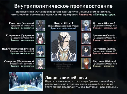 Несколько инсайдеров проекта Genshin Impact, а именно keitarogg и homdgcat при помощи канала Снежная Федерация решили раскрыть подробности характеров не только Предвестников Фатуи, Коломбины и Капитано, но и их предводителя – Пьеро.
