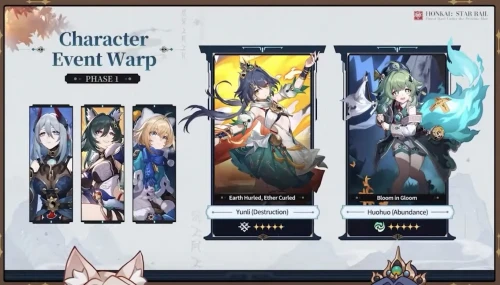 Первым делом рассмотрим баннеры будущего апдейта. В его первой половине разработчики выпустят талантливую мечницу Юньли (Разрушение: Физический) и проведут реран Хохо (Изобилие: Ветряной), а компанию им составят следующие 4-звездочные персонажи: Ханья (Гармония: Физический), Рысь (Изобилие: Квантовый) и Юйкун (Гармония: Мнимый).