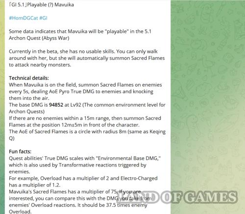 Пользователи HomDGCat и Iris Leaks подтвердили предыдущие сливы, в которых говорилось, что в рамках задания Архонтов появится возможность поиграть за Мавуику. Сообщается, что самостоятельно мы сможем лишь ходить вокруг и использовать обыкновенные атаки. При приближении к врагам автоматически будет активироваться священное пламя, подбрасывающее врагов в воздух и наносящее истинный Пиро урон по области соответствующей площади ультимейта Кэ Цин.