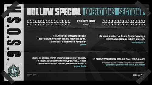 В преддверии выхода патча 1.2 разработчики Zenless Zone Zero начали анонсировать новых персонажей следующей версии 1.3. Первой игрокам была представлена Цукисиро Янаги. Героиня занимает должность заместительницы командира Секции 6. На данный момент единственным игровым агентом из этой фракции является Сокаку.