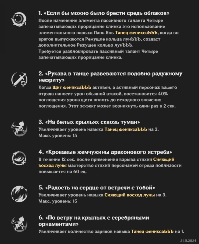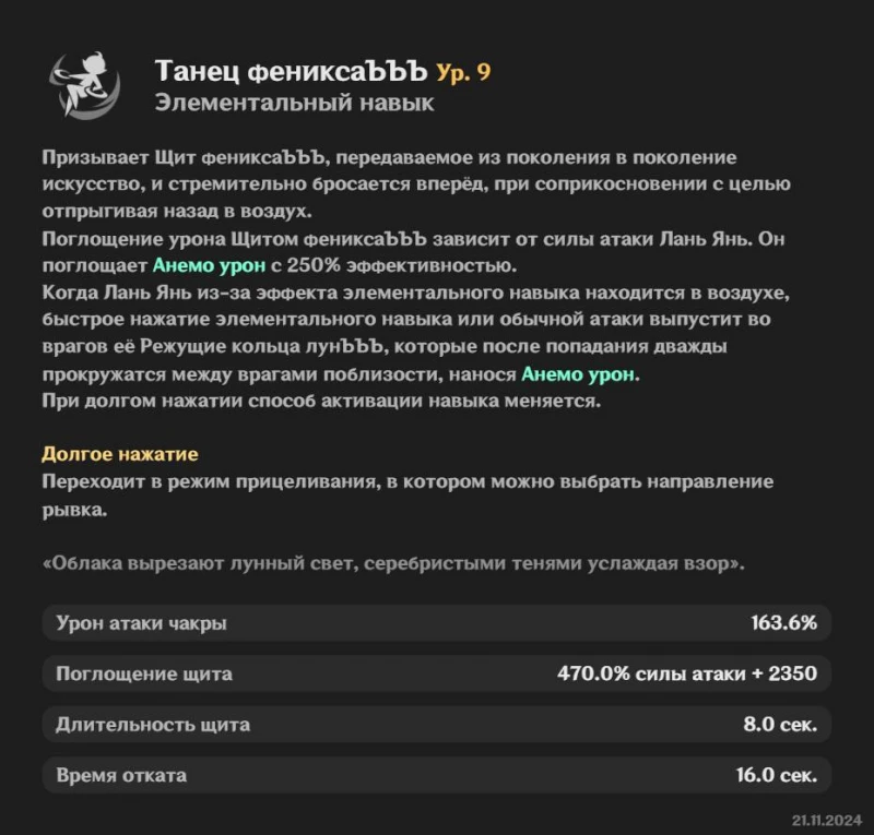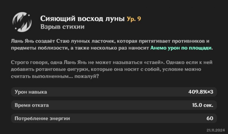 Сильный щит и Анемо атаки делают Лань Ян отличным саппортом на полем боя. Ведь своими способностями она не только защищает, но также и наносит Анемо урон по площади. Скорее всего игроки смогут получить четырехзвездочную Лань Янь бесплатно, в селекторе персонажей во время ежегодного Праздника морских фонарей.