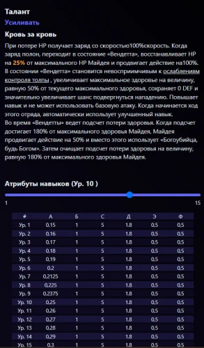 Увеличивает максимальный запас здоровья владельца на 18% и хилл на 20%. При использовании навыка или умения расходует HP в размере 6% от максимального HP владельца и увеличивает урон, наносимый этой атакой, на 30%. Если расход здоровья этого эффекта превышает 500, дополнительно увеличивает урон на 30%. Если текущего запаса здоровья недостаточно, этот эффект может уменьшить запас здоровья минимум до 1.