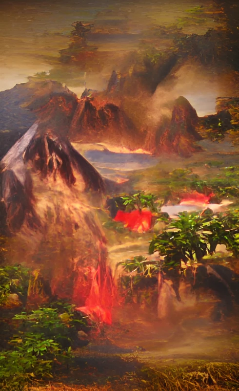 Среди игроков ходят предположения, что Толлан, скорее всего, будет испытанием для нас как с точки зрения исследования, так и выживания. Только представьте себе: мрачные пейзажи, раскаленный воздух и таинственные тропы, которые скрывают древние секреты. Было бы прекрасно увидеть поселение прям рядом с вулканом. Главное, чтобы HoYoverse не сделали это место базовым для Натлана: зеленые поля, цветочки и прочее. Мы попросили нейросеть сгенерировать изображения этой области, но даже она не верит, что будет что-то с лавой под ногами.