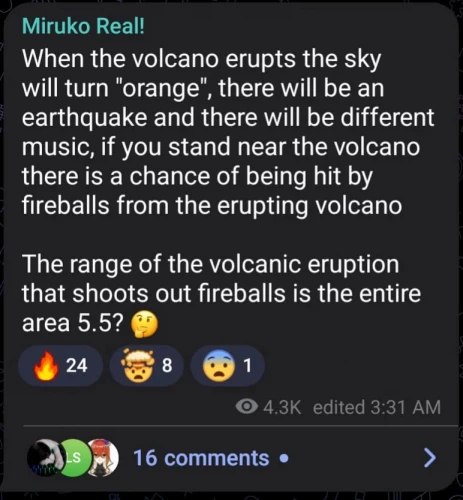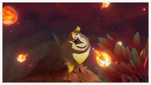 - Огненные снаряды: если игрок окажется слишком близко к вулкану, существует риск быть пораженным огненными шарами, которые выбрасываются из кратера. По слухам, диапазон воздействия этих снарядов может охватывать всю область обновления 5.5.