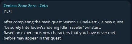 Помимо этого, Zeta сообщил, что после завершения основного квеста Season 1.Final-Part 2 в патче 1.7 откроется новое задание «Leisurely Interlude-Wandering Idle Traveler», которое может представить новых героев. История игры также получит развитие: согласно информации от Palito, в ближайших обновлениях нас ждет Глава 7. Это значимое событие, так как сюжет Zenless Zone Zero развивается постепенно, и новые главы всегда приносят неожиданные повороты. Дополнительно, Seelel подтвердил, что в том же патче появится эпилог первого сезона под названием «Bury the Tears with the Past, Part 2», который подведет итоги текущей истории и подготовит почву для дальнейших событий в мире Нью Эриду.