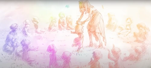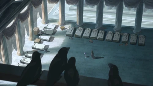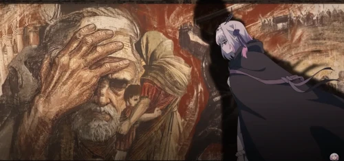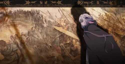 В следующей сцене нам показывают взрослую Касторию, которая отправляется в путешествие, надеясь найти в мире что-то кроме смерти. Однако на своем пути она встречает лишь нескончаемые войны. Она идет вперед, а позади нее возвышаются мрачные фрески, запечатлевшие трагические события. На фоне слышны крики людей, звон мечей и предсмертные стоны – это вечная какофония разрушения, которую она не может остановить и вынуждена лишь наблюдать за ней.