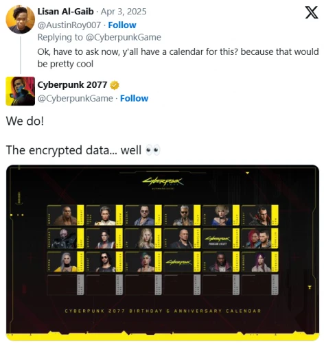 На фоне этого интерес к вселенной подогревает официальный Twitter-аккаунт игры, публикующий изображения, стилизованные под календарь с пометками о днях рождения культовых персонажей: Джонни Сильверхенд, Джуди Альварес, Соломон Рид. Не обошлось и без упоминания годовщины выхода игры – 10 декабря. Некоторые даты на изображении скрыты под надписью «Данные зашифрованы», что породило теории о возможных анонсах ближе к концу года.