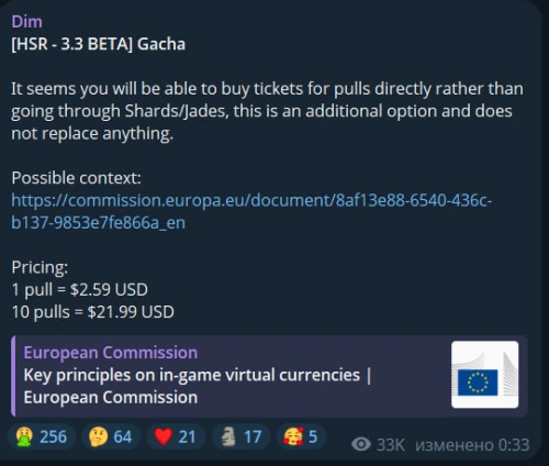 Похоже, в Honkai: Star Rail нас ждет важное изменение – возможность покупать крутки напрямую, без необходимости использовать промежуточную валюту вроде Сущности древних снов или Звездных нефритов. Поводом для этого, судя по всему, послужило одно из недавних постановлений Евросоюза, касающееся прозрачности и доступности внутриигровых покупок.
