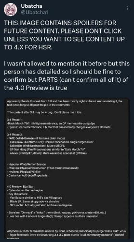 Инсайдер Ubatcha, известный своими сливами о грядущих обновлениях HoYoverse, подтвердил подлинность части предпросмотра патча 4.0 для Honkai: Star Rail. Хотя не все детали можно считать окончательными, слитая информация выглядит весьма правдоподобной, особенно с учетом того, что источником служит старая утечка времен 3.0, большая часть которой уже сбылась.