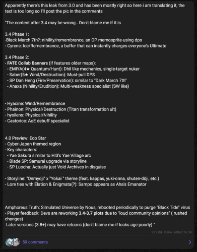 Разработчики также, по слухам, вносят коррективы в сюжет патчей 3.4–3.7, реагируя на сильную критику со стороны комьюнити. В будущем (начиная с 3.8) возможны изменения, поэтому даже проверенные сливы могут частично устареть.