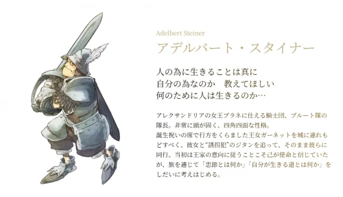 Свежее обновление сайта добавило новый раздел «Персонажи», где теперь можно полюбоваться обновленными иллюстрациями Зидана, Гарнет, Виви и Штайнера. И, что приятно, нарисованы они все тем же Тосиюки Итаханой – оригинальным дизайнером персонажей.