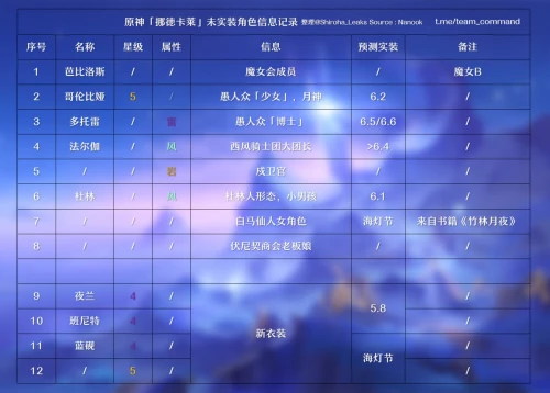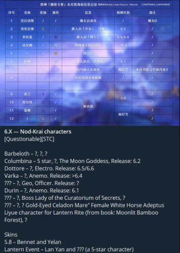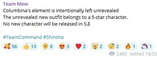 - Коломбина – 5★, стихия неизвестна, «Богиня Луны». Релиз ожидается в версии 6.2. По сообщению инсайдера, стихия Коломбины намеренно скрыта