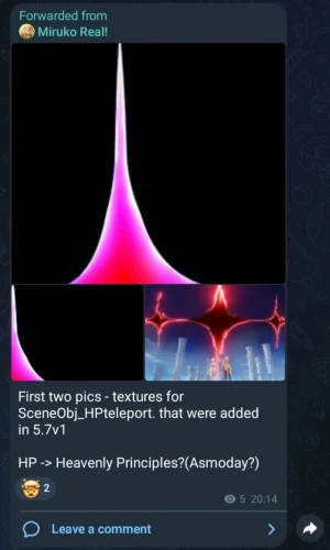 Инсайдер Miruko опубликовал новые текстуры из файлов бета-версии 5.7, визуально напоминающие эффекты, ассоциируемые с Хранительницей небесного порядка, также именуемой Асмодей. Эти материалы сразу вызвали интерес и обсуждение среди сообщества. Дополнительную интригу добавил Firefly, заявивший, что божество появится в сюжетной линии обновления 5.7.