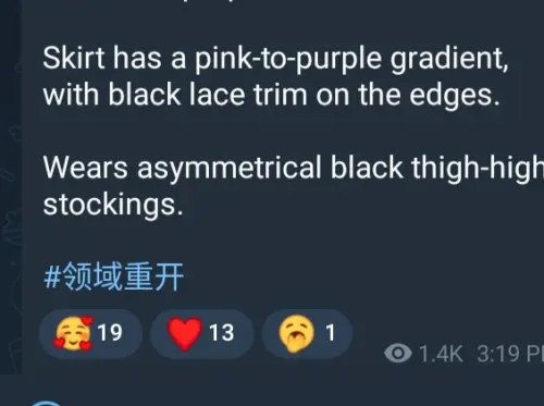 - Ее наряд выполнен в фиолетово-розовой палитре, с градиентной юбкой, черным кружевом, и асимметричными черными чулками