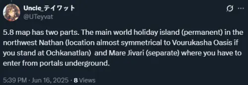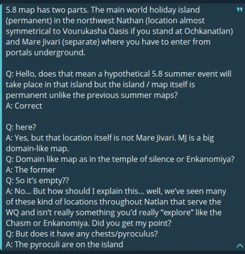 Согласно утечке от UTeyvat, версия 5.8 принесет в игру две полноценные новые локации. Первая – летний ивентовый остров, но в отличие от временных карт прошлых лет, он не исчезнет по завершении события. Это будет постоянная часть мира. Остров расположен на северо-западе Натлана, почти симметрично оазису Вурукаша, если смотреть с территории Очканатлана. Таким образом, его география дополняет уже знакомую карту и, вероятно, будет иметь сюжетную значимость и после ивента.