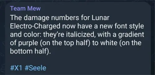 Отдельно инсайдер отметил, что цифры урона при Лунной заряженности теперь отображаются новым шрифтом: курсивом, с градиентом от фиолетового к белому. Похоже, намечается полноценное расширение элементальных механик – возможно, даже новая эра реакций в Нод-Крае.