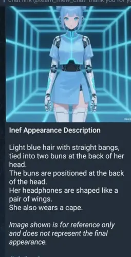По сливу от инсайдера Seele, на ранней стадии разработки у Инеффы светло-голубые волосы с прямой челкой и двумя пучками, завязанными сзади. Уши прикрывают наушники в форме крыльев, а на плечах – плащ.