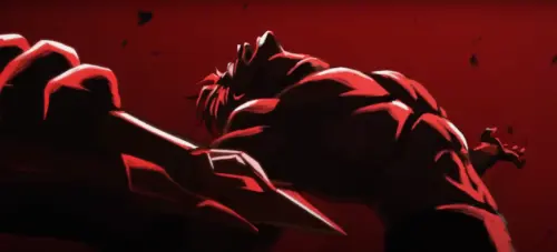 А в это время на Фаенона сыплются враги. Он сражается все безумнее, будто с каждым ударом теряя остатки себя. Он рвет цепи, кричит о желании искупить грехи – и постепенно превращается в существо пылающего гнева. На нем не остается верхней одежды, торс открыт, глаза сверкают, на лице – безумная улыбка. Это уже не отчаяние. Это триумф боли.