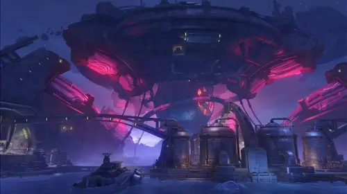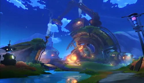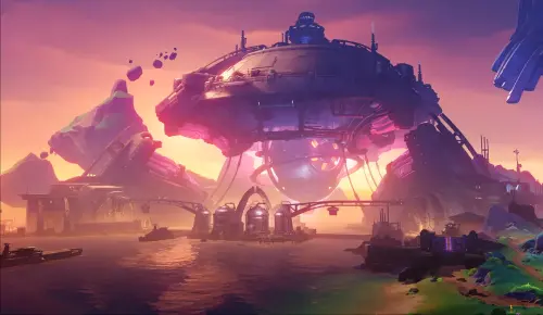 Остров с механическими сооружениями и строениями, которые напоминают завод или научную станцию. В центре находится большое круглое устройство с ярким оранжевым светом, возможно, источник энергии или механизм. Вокруг видна растительность и вода, что создает контраст между природой и технологиями.