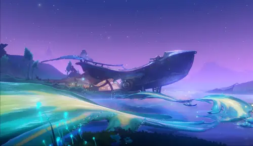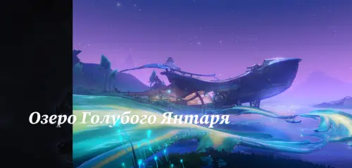 Спокойное, мистическое место с флуоресцентной водой и лодкой у берега. Над озером раскинулось фиолетовое ночное небо со звездами. Атмосфера располагает к уединению и размышлениям.