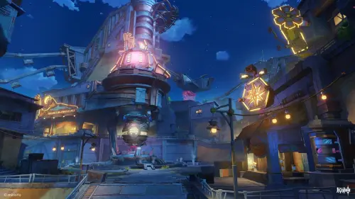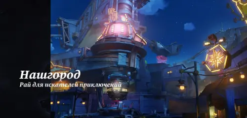 Контраст озеру – технологичный и немного мрачный город с неоновыми вывесками, антеннами и индустриальной архитектурой. Место кажется живым центром механики и городских историй.