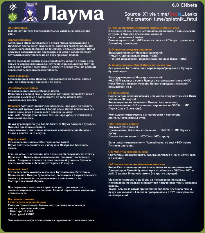 Лаума — пятизвездочная героиня-каталист стихии Дендро, потенциально обладающая интересными способностями для усиления команды и неплохим лечением после получения С1. Это делает Лауму универсальным баффером, полезным для персонажей, играющих через быстрые автоатаки. С открытием созвездий получает больше командной пользы и гибкости.