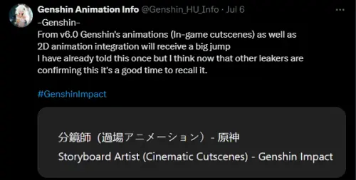 Похоже, что грядущая версия 6.0 Genshin Impact принесет не только новый регион и кучу контента, но и заметный визуальный апгрейд. По словам инсайдеров, HoYoverse планируют серьезно улучшить качество внутриигровых катсцен и анимаций, а также повысить уровень интеграции 2D-анимации.