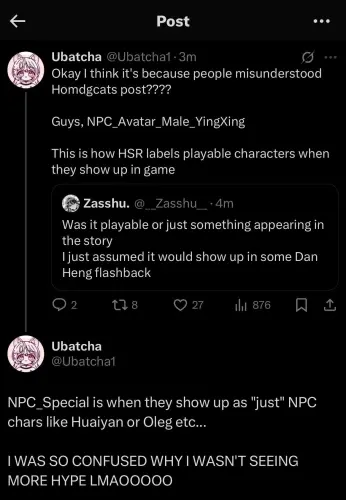 Ubatcha отметил, что путаница возникла из-за недопонимания одного из постов в фанатском сообществе, где фигурировала внутренняя пометка игры «NPC Avatar». На деле, эта метка как раз и используется для персонажей, которые становятся играбельными.