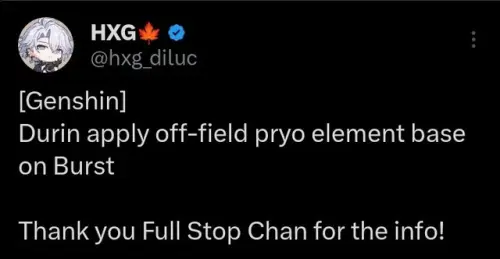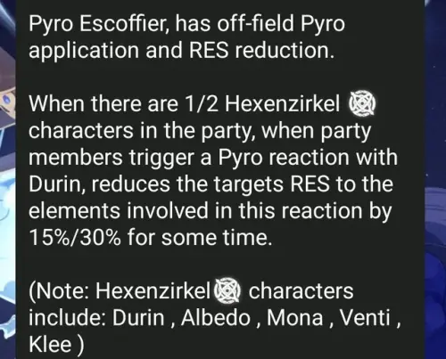Что касается Дурина, ему приписывают довольно интересные механики: Kokomi назвал его Пиро Эскофье, с возможностью накладывать Пиро из кармана и понижать сопротивления. Если в отряде присутствует 1 или 2 персонажа из Ведьминского шабаша, то при срабатывании Пиро-реакций от Дурина сопротивление врагов к элементам, участвующим в этой реакции, снижается на 15% / 30% на некоторое время.