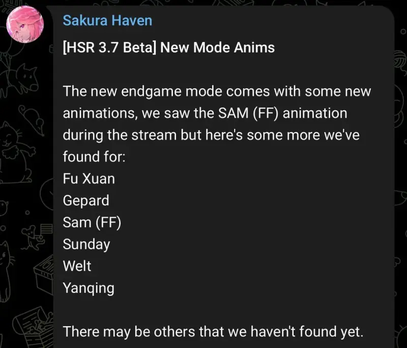 Sakura Haven утверждает, что вместе с новым эндгейм-режимом появятся дополнительные анимации. Во время последнего стрима игрокам уже показали сцену со Светлячком, но в файлах игры нашлись и другие анимации – для Фу Сюань, Гепарда, Воскресенья, Вельта и Яньцина. Возможно, список не окончательный, и позже появятся другие герои.