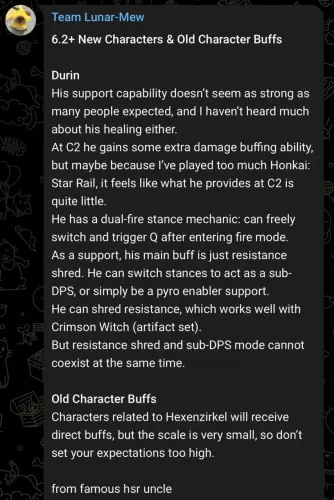 По данным Team Mew и Kokomi, игрокам стоит немного умерить ожидания: возможности поддержки у Дурина выглядят не такими впечатляющими, как многие надеялись.